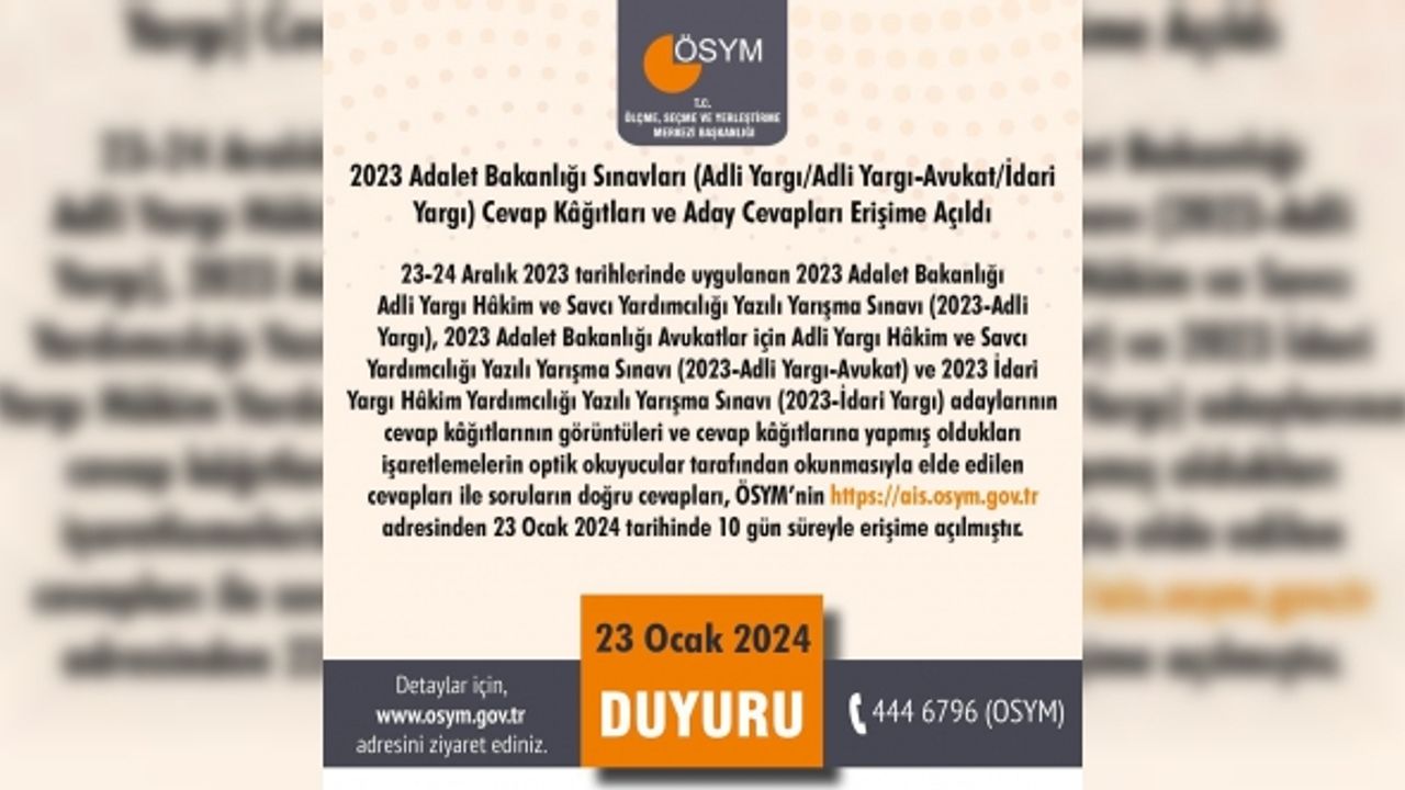 ÖSYM, resmi internet sayfasından yaptığı duyuruda, 23-24 Aralık 2023 tarihlerinde uygulanan 2023 Adalet Bakanlığı Adli Yargı Hakim ve Savcı Yardımcılığı Yazılı Yarışma Sınavı, 2023 Adalet Bakanlığı Avukatlar için Adli Yargı Hakim ve Savcı Yardımcılığı Yazılı Yarışma Sınavı ile 2023 İdari Yargı Hakim Yardımcılığı Yazılı Yarışma Sınavı sonuçlarının açıklandığını paylaştı.