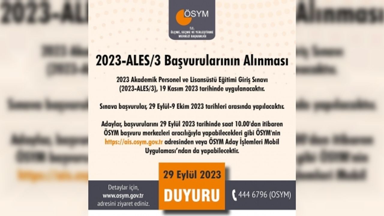 Ölçme, Seçme ve Yerleştirme Merkezi Başkanlığı (ÖSYM), 2023 Akademik Personel ve Lisansüstü Eğitimi Giriş Sınavı (2023-ALES/3) başvurularının başladığını duyurdu.