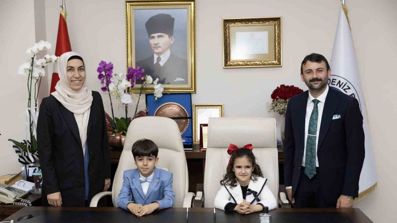 Mersin’in merkez ilçe Akdeniz Belediye Başkanı Hoşyar Sarıyıldız, 23 Nisan Ulusal Egemenlik ve Çocuk Bayramı dolayısıyla koltuğunu, Devrim Geriş ile Tuna Akdoğan adlı çocuklara devretti.