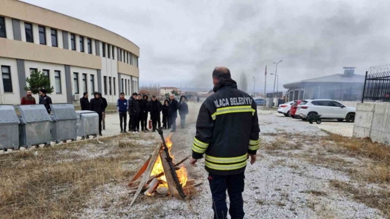 Kredi Yurtlar Kurumu tarafından Hitit Üniversitesi Alaca Meslek Yüksekokulu öğrencilerinin yangın anında neler yapmaları gerektiğini uygulamalı tatbikat düzenlendi. Alaca Belediyesi itfaiye ekiplerinin de katıldığı yangın tatbikatında, itfaiye ekipler tarafından yakılan ateşe yangın söndürme tüpü ile müdahale edildi. Öğrencilere yangına müdahale ederken ateşe ne kadar uzaklıktan söndürme tüpünü tutulması gerektiği uygulamalı olarak gösterildi.