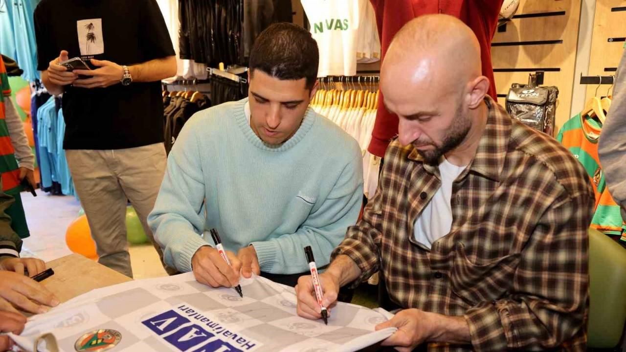 Corendon Alanyasporlu futbolcular Efecan Karaca ve Joao Novais, düzenlenen imza gününde taraftarlarla bir araya geldi.