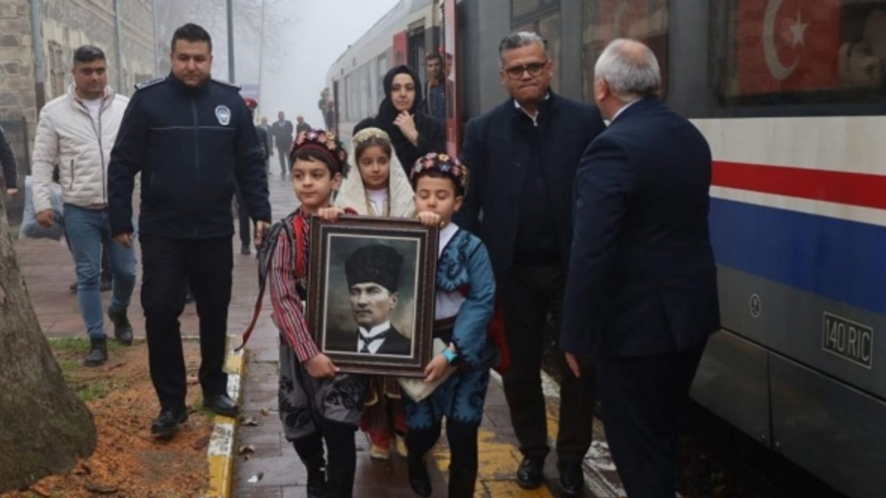 Uşak-İzmir seferini yapan trenden Atatürk tablosunu indiren öğrenciler, Türk bayrağı ve Atatürk tablosunu Kaymakamı Temur’a takdim etti.