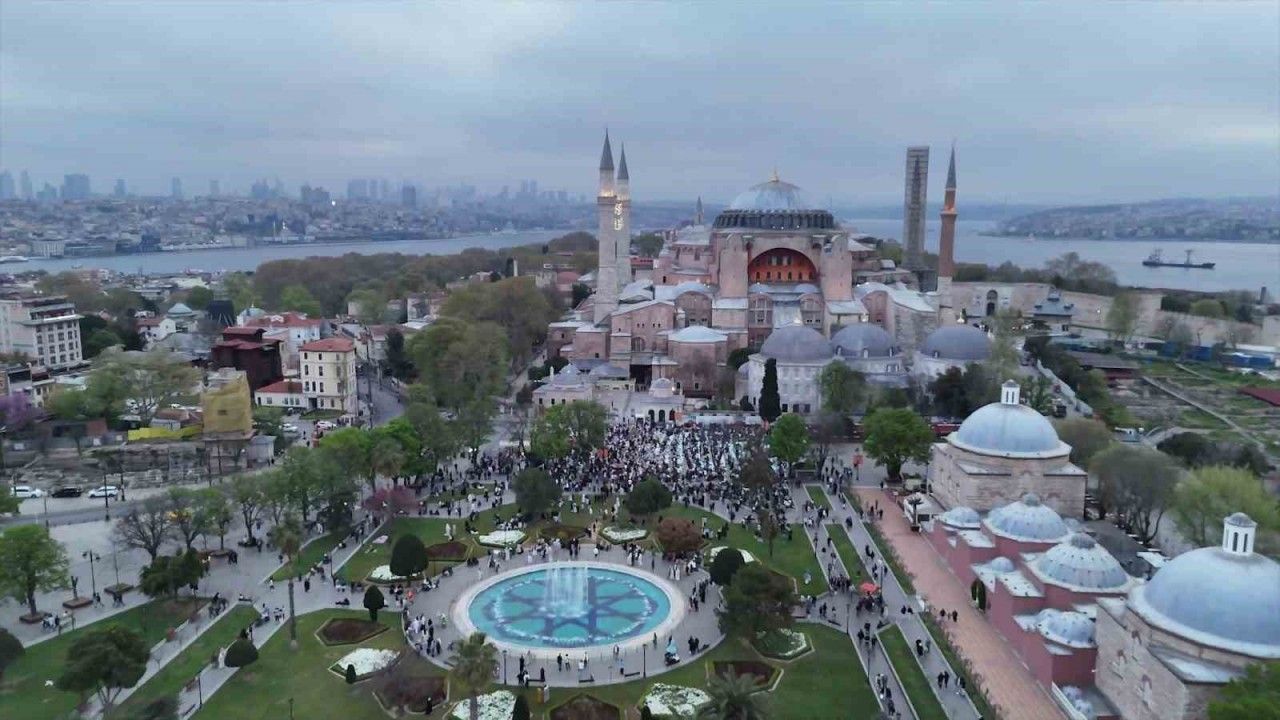 11 ayın sultanı Ramazan ayının bitmesinin ardından tüm Türkiye’de olduğu gibi İstanbul’da da bayram hareketliliği yaşanıyor. Çok sayıda vatandaş bayram namazı için de sabahın erken saatlerinden itibaren Ayasofya-i Kebir Cami-i Şerifi’ne akın etti. Namazdan önce caminin içi dolarken, içeriye giremeyen vatandaşlar avluda bayram namazını eda etti.