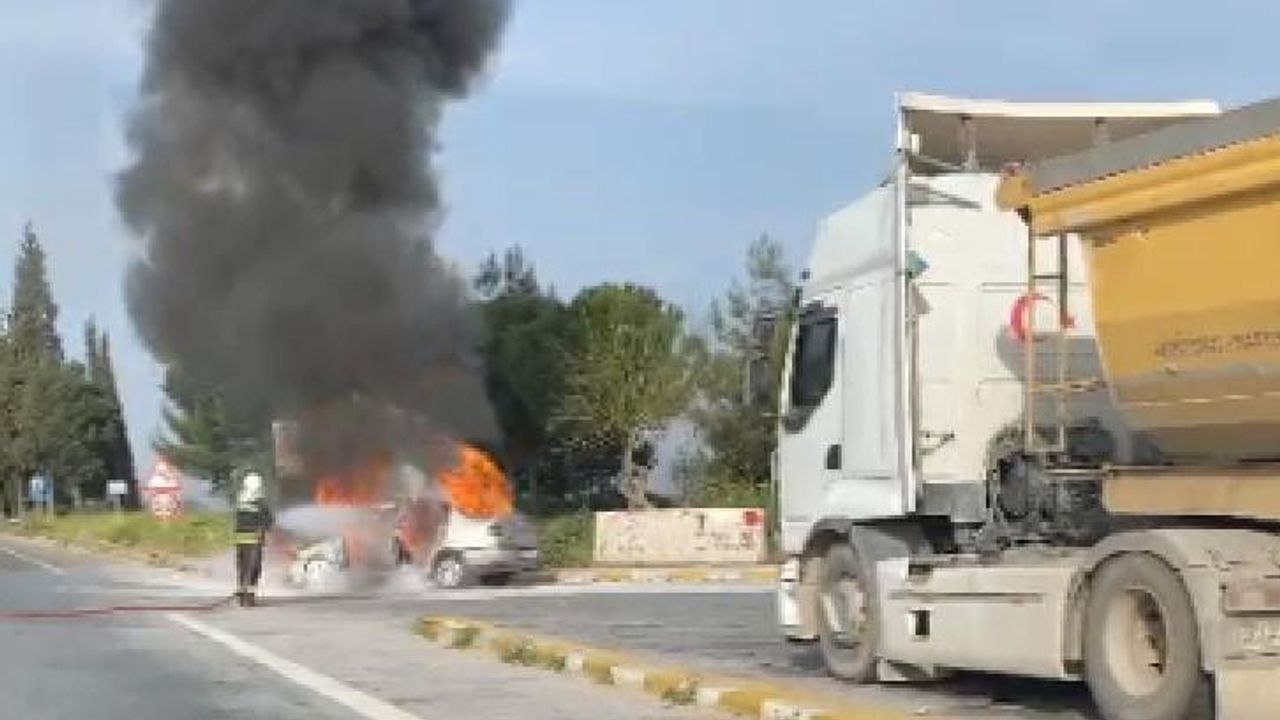 Aydın’ın Germencik ilçesinde otoyolu çıkışında bir otomobil alev alırken, itfaiye ekipleri alev topuna dönen araca müdahale etti.