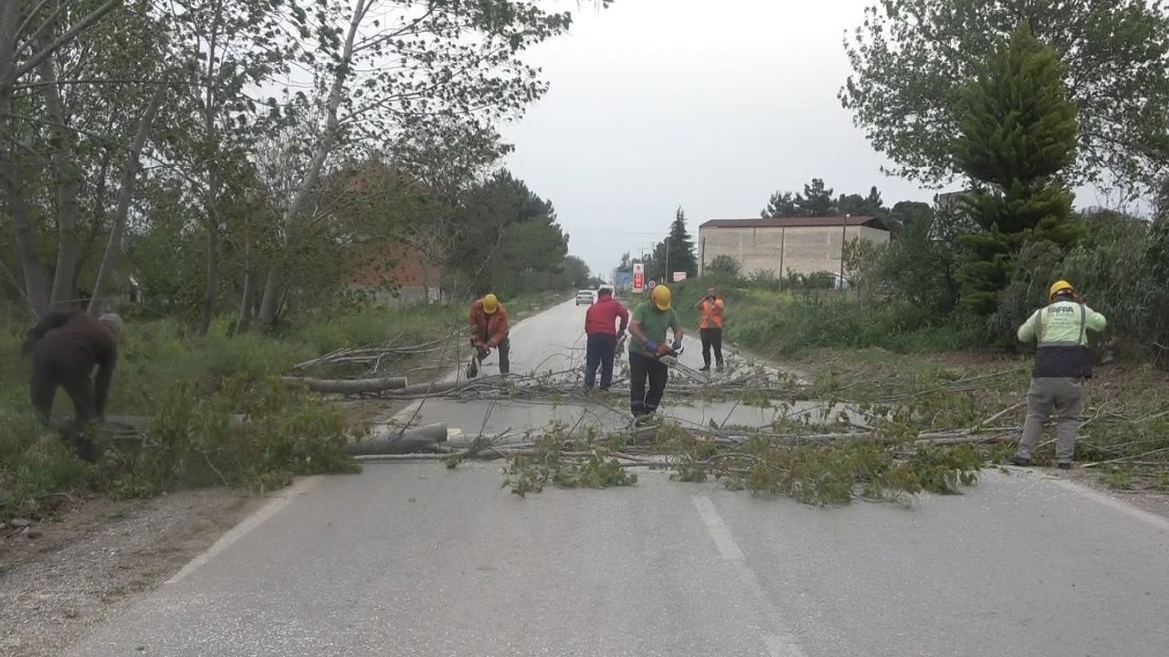 Samsun’un Bafra ilçesinde kuvvetli rüzgar nedeniyle ağaçlar devrildi. Devrilen ağaçlar elektrik tellerini kopardı.