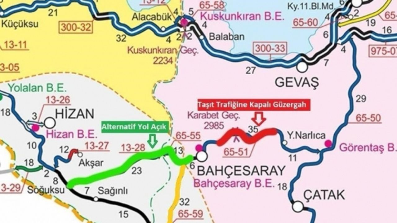 Bahçesaray Kaymakamlığı sosyal medya hesabından yaptığı paylaşımda, "Karayolları ekiplerince yoğun kar yağışı ve tipi nedeniyle görüş mesafesi tehlike teşkil edecek duruma gelmiştir. Bundan dolayı Bahçesaray’ın Liman Mahallesi mevkisi ile Çatak ilçesine bağlı Yukarı Narlıca Mahallesi güzergahı geçici olarak çift yönlü trafiğe kapatılmıştır" denildi.