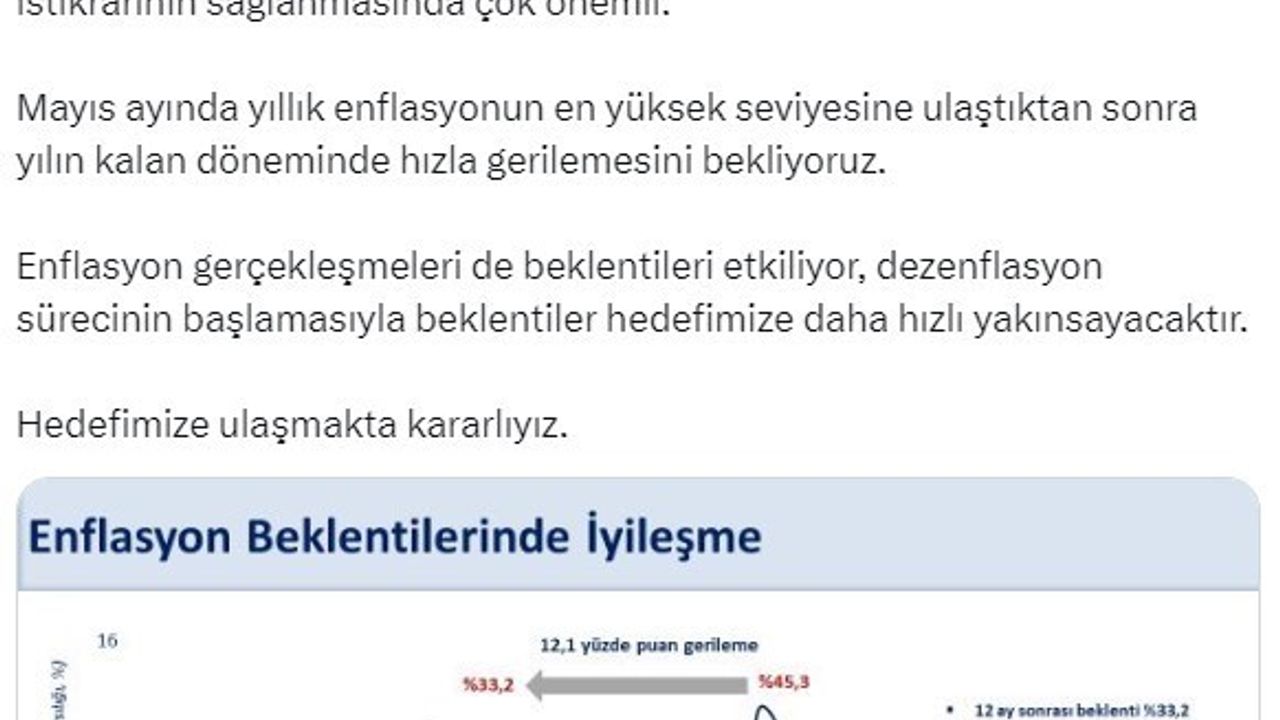 Bakan Şimşek, X hesabından yaptığı paylaşımda enflasyon beklentileri hakkında bilgi verdi. Şimşek, ekonomi programının olumlu sonuçlarının enflasyon beklentilerine de yansıdığını belirterek, "Yıl sonu enflasyon beklentisinde gerileme devam ederken, 12 ay sonrası beklenti ekim ayına kıyasla 12,1 puan azalarak yüzde 33,2 oldu. Beklentilerdeki iyileşme, enflasyon ataletinin kırılmasında ve kalıcı fiyat istikrarının sağlanmasında çok önemli. Mayıs ayında yıllık enflasyonun en yüksek seviyesine ulaştıktan sonra yılın kalan döneminde hızla gerilemesini bekliyoruz. Enflasyon gerçekleşmeleri de beklentileri etkiliyor, dezenflasyon sürecinin başlamasıyla beklentiler hedefimize daha hızlı yakınsayacaktır. Hedefimize ulaşmakta kararlıyız" ifadelerini kullandı.