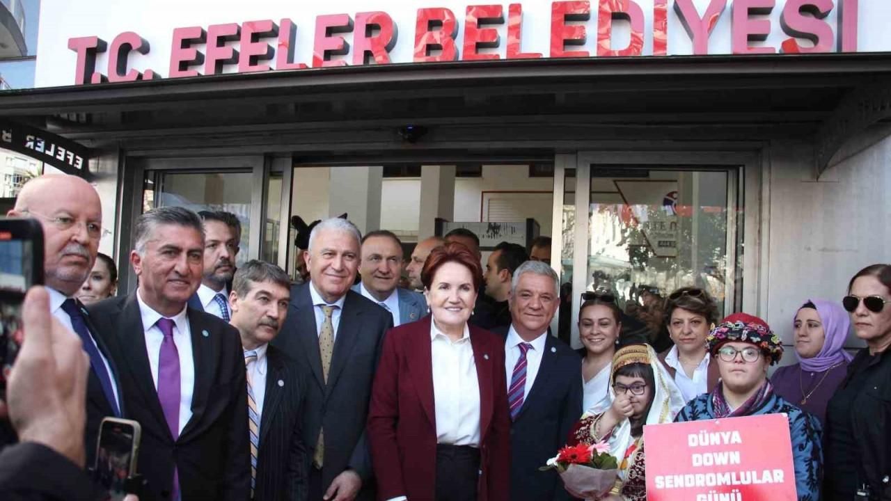31 Mart yerel seçimlerine sayılı günler kala Aydın’a gelen İYİ Parti Genel Başkanı Meral Akşener’in ilk durağı Efeler ilçesi oldu. İYİ Parti Genel Başkanı Akşener’i otoban çıkışında karşılayan Efeler Belediye Başkanı Mehmet Fatih Atay ve siyasi yöneticiler Akşener ile birlikte otobüste şehir turu atarak Efeler Belediyesi hizmet binası önüne geldi. Efeler Belediyesi önünde pankartlarla karşılanan Akşener’e Efeler Belediyesi tarafından açılan Yüzde Yüz Kadın Emeği Tarımsal Ürün Fabrikası’nda üretilen yerel ürünlerden oluşan sepetler hediye edildi. Akşener’i makamında ağırlayan Efeler Belediye Başkanı Mehmet Fatih Atay, Akşener’e Aydın’ın sembolü Tralleis Antik Kenti’ndeki ’üçgözler’ olarak bilinen tarihi yapının sembolünün yer aldığı plaket, Akşener’de Başkan Atay’a işlemeli vazo hediye etti.