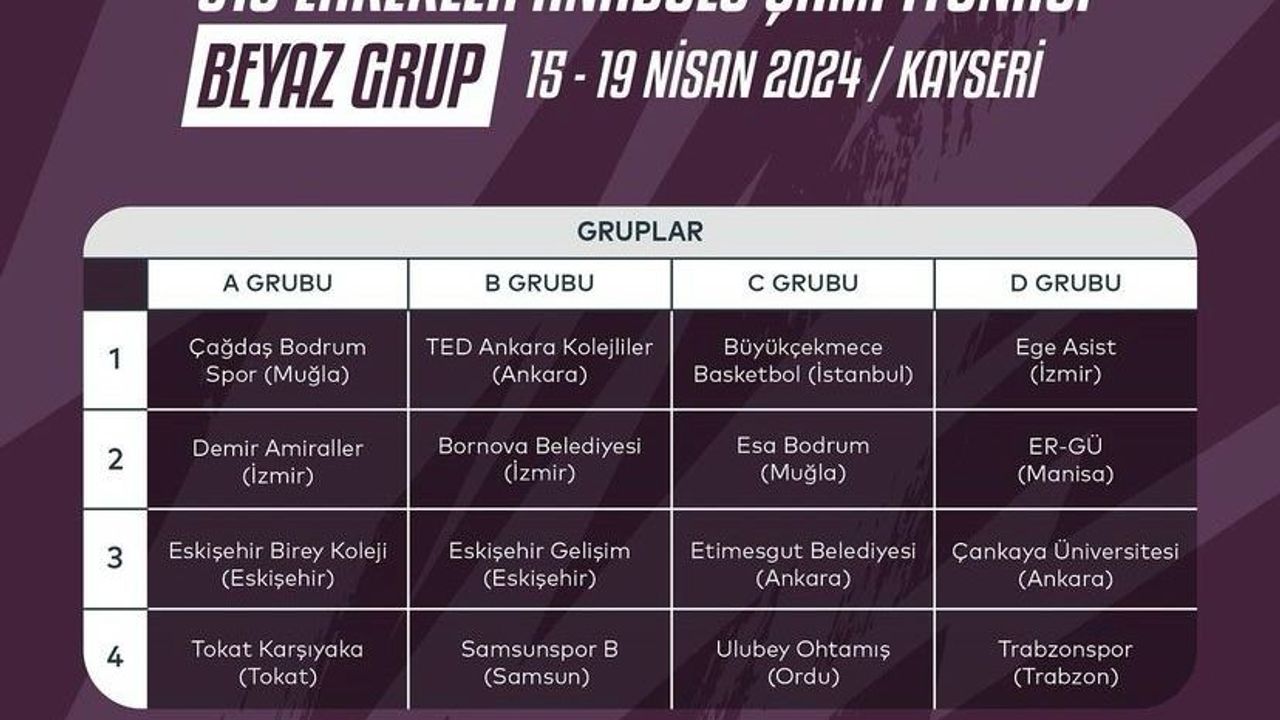 Türkiye Basketbol Federasyonu’nun 2023-2024 sezonu Yurt İçi Faaliyetleri Programı çerçevesinde düzenlediği U18 (Erkek-Kız) Anadolu Şampiyonaları katılımcıları belli oldu. U18 Anadolu Şampiyonaları Erkeklerde; Afyonkarahisar ve Kayseri, Kızlarda ise Sakarya ve Uşak illerinde düzenlenecek. 4 farklı şehirde 64 takımın yer aldığı U18 Anadolu Şampiyonalarında yaklaşık 800 sporcu ter dökecek. Kayseri’de oynanacak olan ErkeklerBeyaz Grup maçlarına katılacak takım ve grupları şöyle: