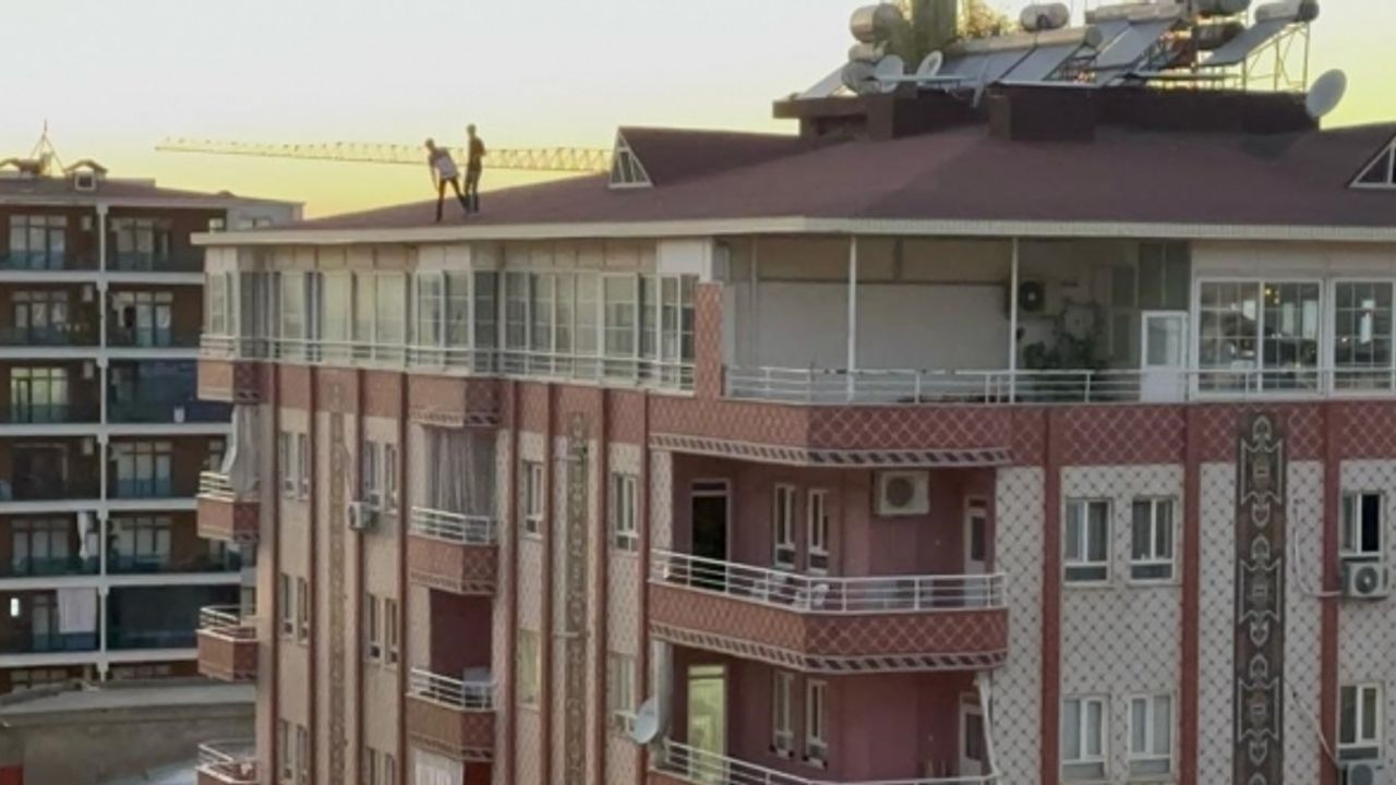 Gültepe Mahallesi’nde iki genç, hiçbir güvenlik önlemi almadan çatıya çıktı. Zaman zaman çatının kenarına kadar gelen gençler, yürekli ağza getirdi. O anlar yan binadaki vatandaşların cep telefonu kameralarına yansıdı.