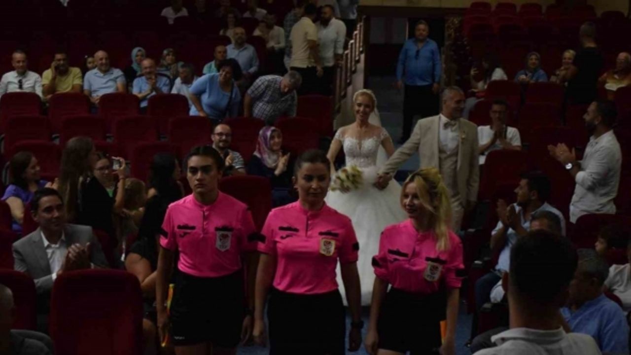 Manisa’da uzun yıllar hakemlik yapan Türkiye Futbol Federasyonu gözlemcilerinden Uygar Yakup Olgar’ın nikah töreni, davetlilere ’Böyle olur hakemlerin nikahı’ dedirtti.