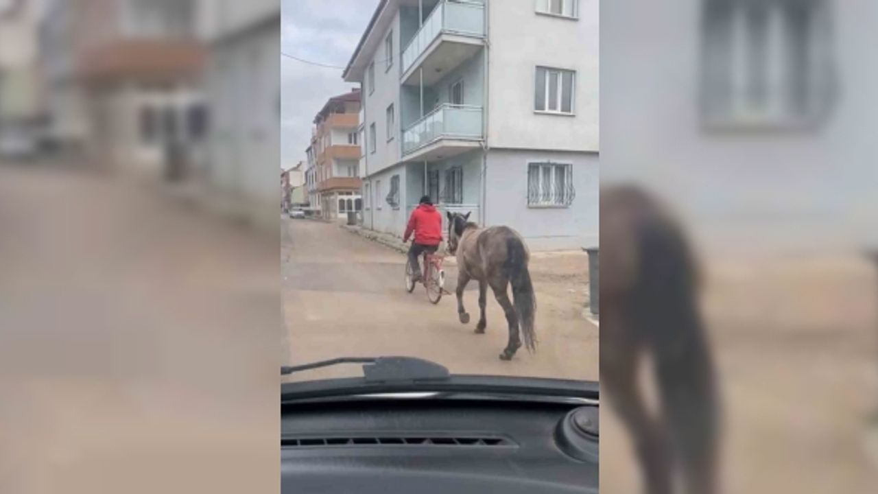 Bursa’nın İnegöl ilçesinde bisikletine atı bağlayarak götüren şahıs cep telefon kamerasına yansıdı.