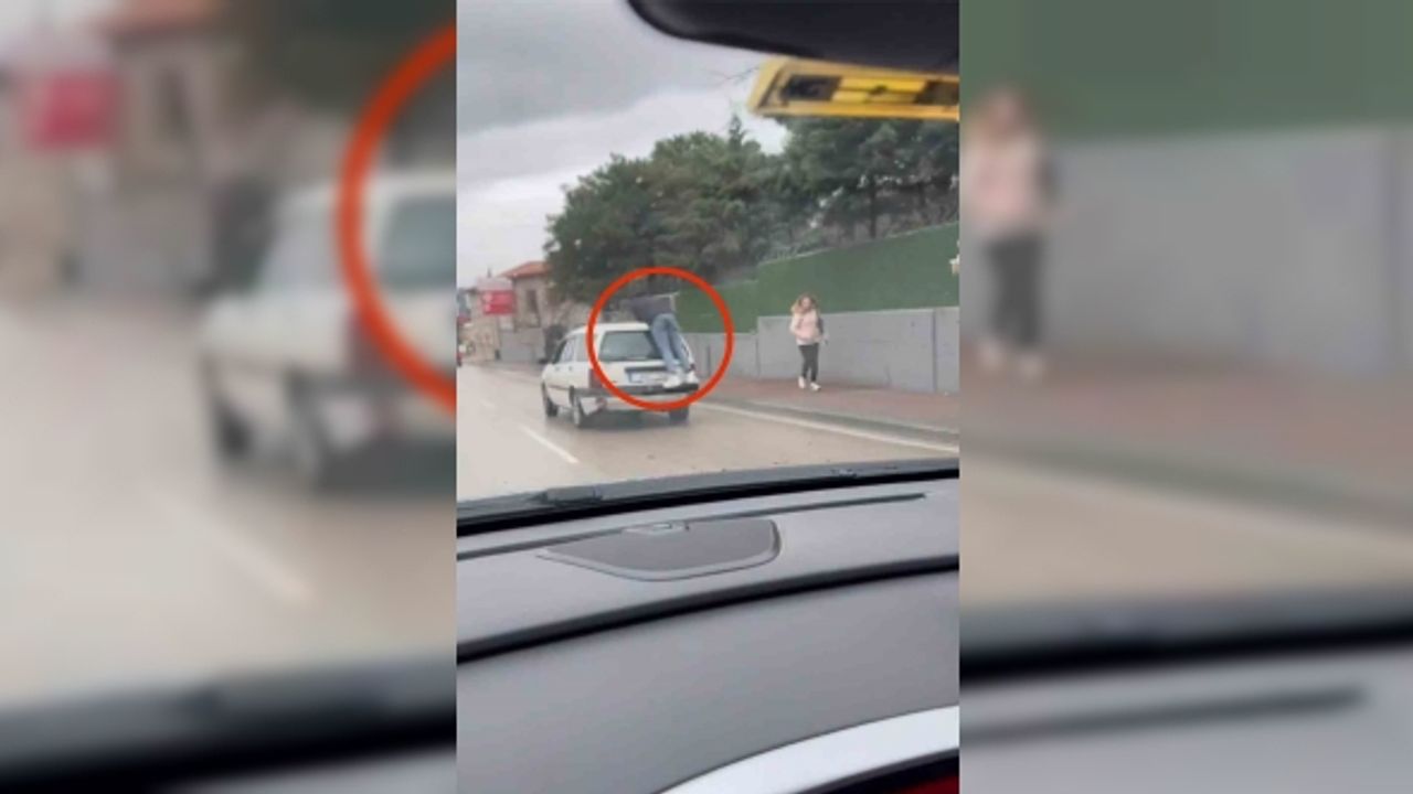 Olay, merkez Osmangazi ilçesinde meydana geldi. Seyir halindeki otomobilin bagajına basarak tavanına tutunan şahıs, bir süre bu şekilde seyahat etti. Diğer sürücülerin kornalı ikazına aldırış etmeyerek, hem kendi canını tehlikeye atan hem de diğer sürücülere zor anlar yaşatan şahıs, yolculuğuna bir süre daha devam ettikten sonra son verdi. O anlar ise saniye saniye amatör kameraya yansıdı.
