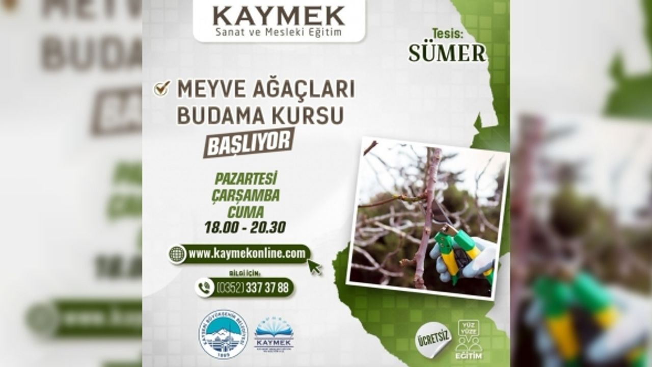 Kayseri’de halkın ihtiyaçları ile vatandaşlardan gelen talepler doğrultusunda sürekli yeni kurs ve etkinliklere imza atan büyükşehir belediyesi bünyesindeki KAYMEK, bu kez de yoğun talepte bulunulan bir kursu hizmete sundu. Yoğun talep dolayısıyla kayıtların dolduğu ve kısa süre içerisinde başlayacak Meyve Ağaçları Budama Kursu, ücretsiz olarak KAYMEK Sümer Tesisleri’nde pazartesi, çarşamba ve cuma günleri olmak üzere haftanın 3 günü saat 18.00-20.30 arasında planlanan şekilde gerçekleştirilecek.