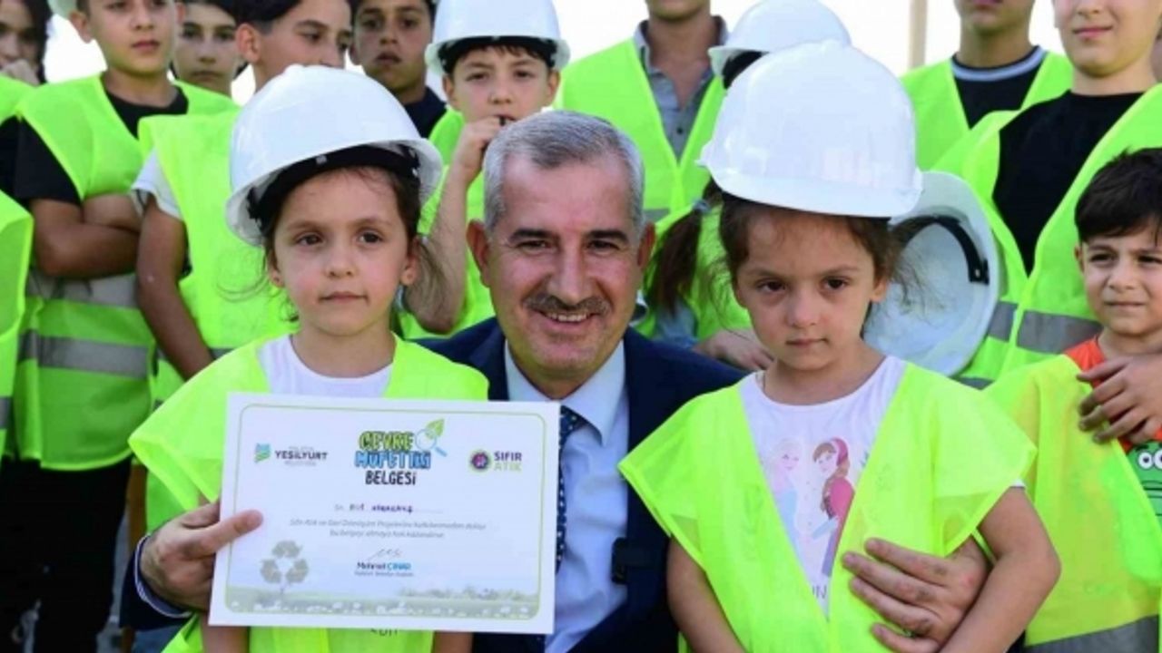 Yeşilyurt Belediye Başkanı Mehmet Çınar, Yeşilyurt Belediyesi İklim Değişikliği ve Sıfır Atık Müdürlüğü tarafından düzenlenen ‘Sıfır Atık ve Çevre Bilinci’ eğitimlerine katılan öğrencilere Ambalaj Atığı Toplama Ayırma Tesisinde düzenlenen törenle ‘Çevre Müfettişi Belgesi’ takdim etti.