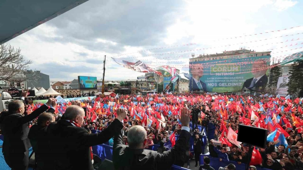 Cumhurbaşkanı Recep Tayyip Erdoğan, 31 Mart Mahalli İdareler Seçimleri öncesinde Çorum’da düzenlenen mitinge katılarak vatandaşlara seslendi. Çorum il merkezindeki Kadeş Barış Meydanı’nda konuşan Cumhurbaşkanı Erdoğan, “Çorum’un güzelliğini, siz değerli kardeşlerimin şu güzelliğini satın almaya dünyanın gücü yetmez. Dedim bir sorun, Çorum’da ne kadar katılım var, 40 bin kişi. Çorum bugün bir başka güzel. Çorum ile bizim aramıza kimse giremez. Yiğidin harman olduğu yer Çorum, bitti. Çorum ile olan yol ve dava arkadaşlığımızın bizde yeri ayrıdır. Çorum kurulduğu günden beri harekatımızı bağrına basmıştır. Bugüne kadar girdiğimiz 17 seçimin hepsinde sizlerin desteğini, duasını, sevdasını hep yanımızda gördük. Siz bizi yalnız bırakmadınız. 14-28 Mayıs seçimlerinde de hamd olsun bu gelenek değişmedi. Türkiye’nin en kritik seçimlerinden bir tanesinde Çorumlu kardeşlerimiz bize, Cumhur İttifakı’na sahip çıktı. Cumhur İttifakı’na, milletvekilliğinde yüzde 60,50, Cumhurbaşkanlığı seçiminde yüzde 65’i bulan oy oranları ile destek veren Çorum’a şükranlarımı sunuyorum. Biz Çorum’dan razıyız, Allah da sizden razı olsun. Siz nasıl bize sahip çıktıysanız, biz de size teşekkür borcumuzu daha faza teşekkür ederek yerine getireceğiz. Çorum’un her meselesi, her sıkıntısı, her talebi bizim meselemizdir. Bugüne kadar el ele, omuz omuza verdik. Çorum’u bölgesinin en gözde, en güzel şehirlerinden bir tanesine dönüştürdük. Artan ihracatı ile üretimiyle, sanayisiyle, dinamik ekonomisiyle Çorum bir başarı örneği olarak tüm Türkiye’de, kendinden söz ettiriyor. Yapacağımız ilave yatırımlarla Çorum’un bu vasfını inşallah daha da güçlendireceğiz. Hepimiz şu gerçeği çok iyi biliyoruz, Çorum’un elde ettiği başarılarda hükümetimizin icraatlarının yanı sıra, belediyemizin çalışmalarının da önemli payı var. Şehrimizde rahmetli Arif Ersoy hocamızla başlayan hizmet ve eser siyaseti sonraki gelen arkadaşlarımız tarafından da devam ettirildi. Rabbim hepsinden razı olsun. Sanayicisi, tüccarı, üreticisi, çiftçisiyle tüm Çorumlu kardeşlerimiz de bu çabalarımızda bize destek verdi. Çorum’un başarı hikayesini hep beraber yazdık. Sizler çalıştınız, didindiniz, kabuğunuzu kırmak için mücadele ettiniz. Biz de her alanda sizleri destekledik, önünüzü açtık, işinizi kolaylaştırdık. İnşallah 31 Mart’ta bu birlikteliğimizi daha da perçinleyeceğiz. Çorum’un yeni başarılara imza atması için ne gerekiyorsa yapacağız. Ama onun için 31 Mart imtihanını vermemiz gerekiyor. 31 Mart’ta yine özellikle Çorum’un destan yazacağından şüphe duymuyorum. 1994’ten beri tam 30 yıldır sürdürdüğümüz güzel geleneği yine bozmayacağız. Çorum’da gerçek belediyecilikle durmak yok, yola devam. Karşımdaki şu meydanda 31 Mart seçiminin zaferini duyuyorum. Öyle bir ses verin ki yankısı Ankara’ya ulaşsın” dedi.