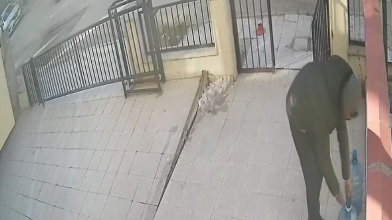 Eskişehir’de bir apartmanın önünde duran damacanaya asılı su parasının çalındığı anlar güvenlik kameralarına yansıdı.