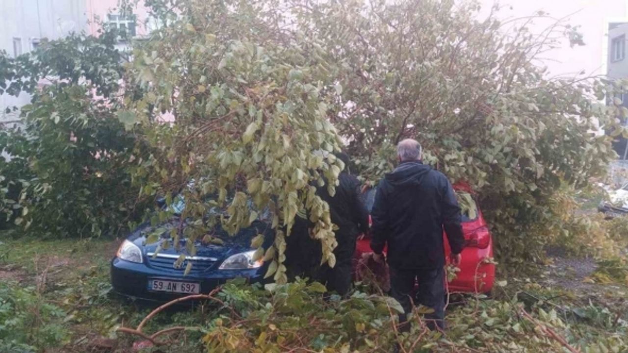 Tekirdağ’ın Süleymanpaşa ilçesinde fırtınanın etkisine dayanamayan dev ağaç, park halindeki 3 aracın üzerine devrildi.