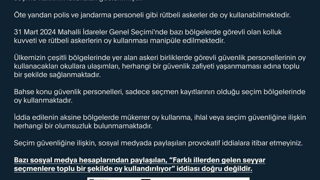 Açıklamada, polis ve jandarma personeli gibi rütbeli askerlerin de oy kullanabildiği belirtildi. 31 Mart 2024 Mahalli İdareler Genel Seçimi’nde bazı bölgelerde görevli olan kolluk kuvveti ve rütbeli askerlerin oy kullanması manipüle edildiği vurgulanan açıklamada, “Ülkemizin çeşitli bölgelerinde yer alan askeri birliklerde görevli güvenlik personellerinin oy kullanacakları okullara ulaşımları, herhangi bir güvenlik zafiyeti yaşanmaması adına toplu bir şekilde sağlanmaktadır. Bahse konu güvenlik personelleri, sadece seçmen kayıtlarının olduğu seçim bölgelerinde oy kullanmaktadır. İddia edilenin aksine bölgelerde mükerrer oy kullanma, ihlal veya seçim güvenliğine ilişkin herhangi bir olumsuzluk bulunmamaktadır. Seçim güvenliğine ilişkin, sosyal medyada paylaşılan provokatif iddialara itibar etmeyiniz” ifadelerini kullandı.