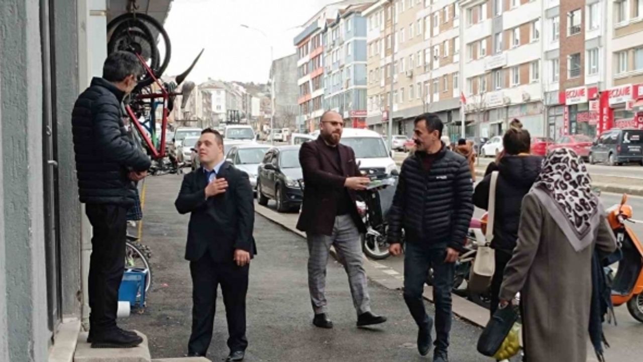 Emek Mahalle muhtar adayı olan 25 yaşındaki down sendromlu Mücahit Kırdaş, her evi ve esnafı dolaşarak oylarına talip olduğunu belirterek yapacağı hizmetleri anlatıyor.