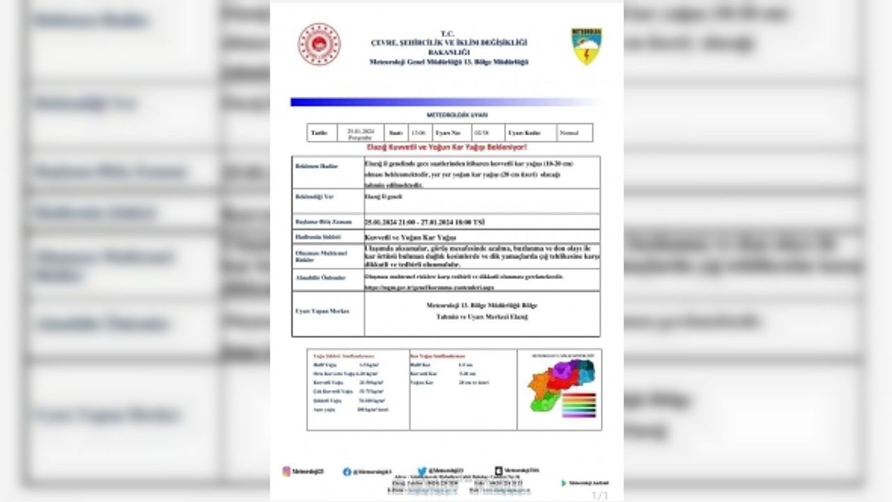 Meteoroloji 13. Bölge Müdürlüğünden yapılan açıklamada, “Elazığ genelinde gece saatlerinden itibaren, kuvvetli kar yağışı olması beklenmektedir. Yer yer yoğun kar yağışı 20 santimetre üzerinde olacağı tahmin edilmektedir. Ulaşımda aksamalar, görüş mesafesinde azalma, buzlanma ve don olayı ile kar örtüsü bulunan dağlık kesimlerde ve dik yamaçlarda çığ tehlikesine karşı dikkatli ve tedbirli olunmalıdır” denildi.