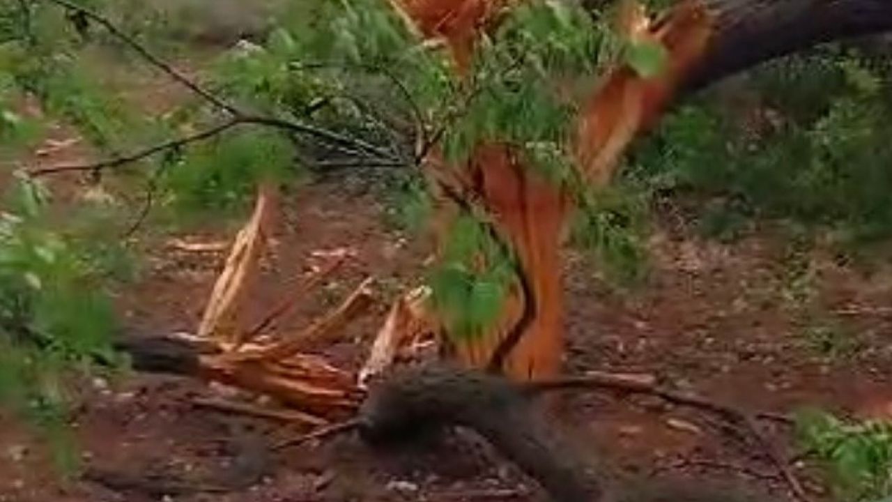 Elazığ’da gök gürültülü sağanak yağış sırasında yıldırım isabet eden ağaç ikiye ayrıldı.