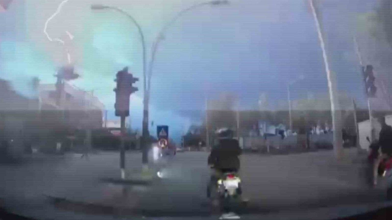 Hatay’ın Dörtyol ilçesinde yıldırımın düşmesiyle birlikte elektrik direğinde yaşanan patlama araç kamerasına yansıdı.