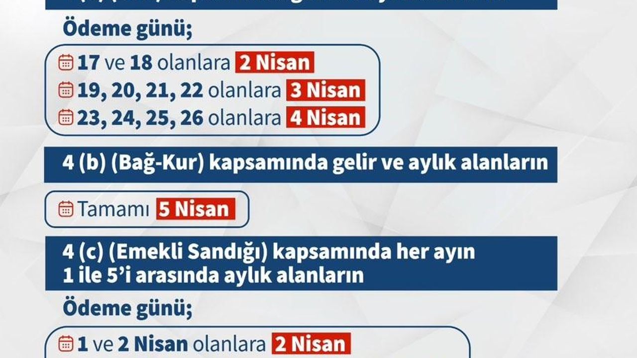 Sosyal Güvenlik Kurumu (SGK) tarafından yapılan açıklamaya göre 4/a SSK kapsamında gelir ve aylık alanların ödeme günü, 17 ve 18 olanlara 2 Nisan’da, ödem günü 19, 20, 21 ve 22 olanlara 3 Nisan’da, ödeme günü 23, 24, 25 ve 26 olanlara ise 4 Nisan’da emekli ikramiyeleri yatırılacak.