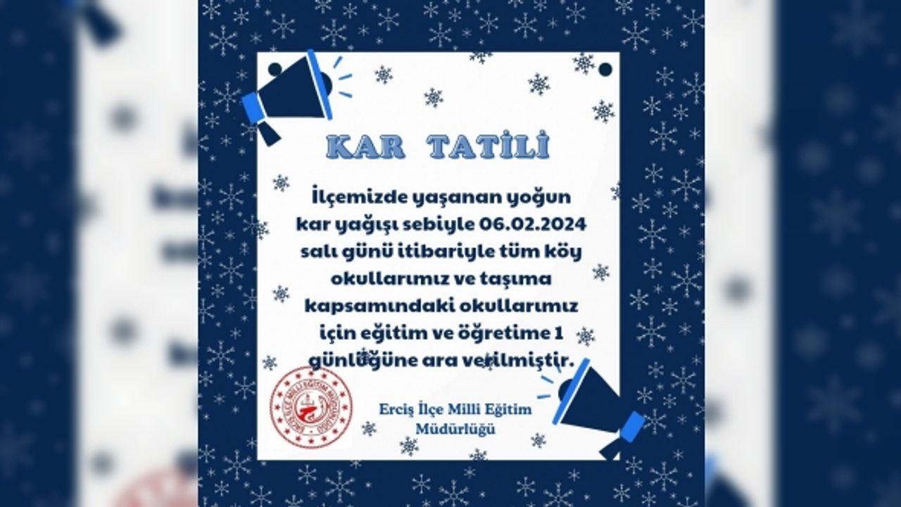 Erciş Milli Eğitim Müdürlüğü sosyal medya hesaplarından yapılan paylaşımda, "Erciş ilçemizde devam eden yoğun kar yağışı nedeniyle 06.02.2024 salı günü itibariyle tüm köy okullarımız ve taşımalı okullarımız için eğitim-öğretime 1 gün süre ile ara verilmiştir. Merkez okullarımız, Haydarbey, Yukarı ve Aşağı Işıklı İlköğretim okulunda eğitime devam edilecektir." denildi.