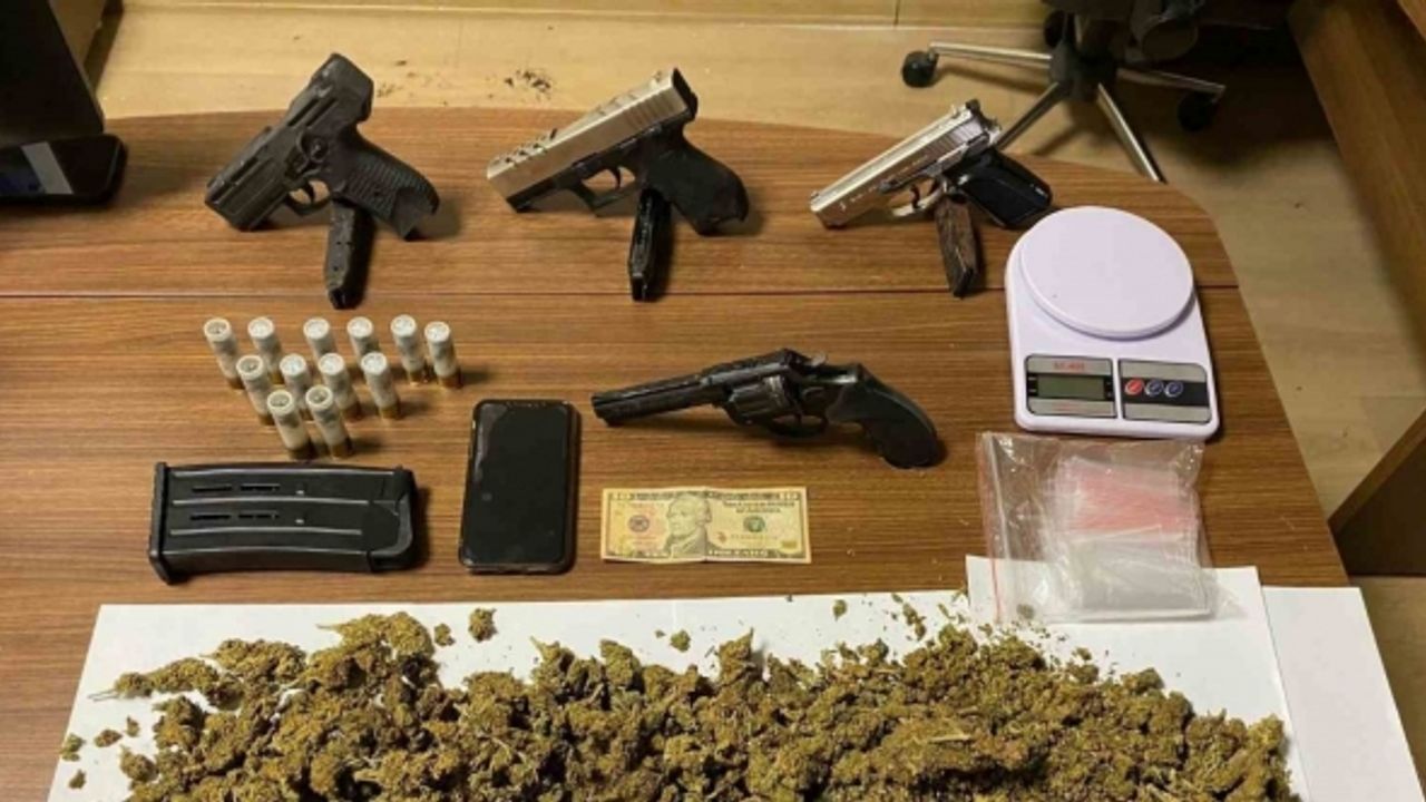 Adreslerde yapılan aramalarda 556 gram marihuana, 10 adet kırmızı reçeteli tablet, 5 adet ruhsatsız tabanca, 1 adet pompalı tüfek şarjörü ile 4 adet tabanca şarjörü, 11 adet av fişeği ile 4 adet tabanca fişeği, 2 adet hassas terazi ve 50 bin 150 lira nakit para ele geçirildi. Gözaltına alınan şüpheliler emniyetteki işlemlerinin adliyeye sevk edildi. Şahıslardan B.A. serbest bırakılırken, H.K.A. ise tutuklanarak cezaevine gönderildi.