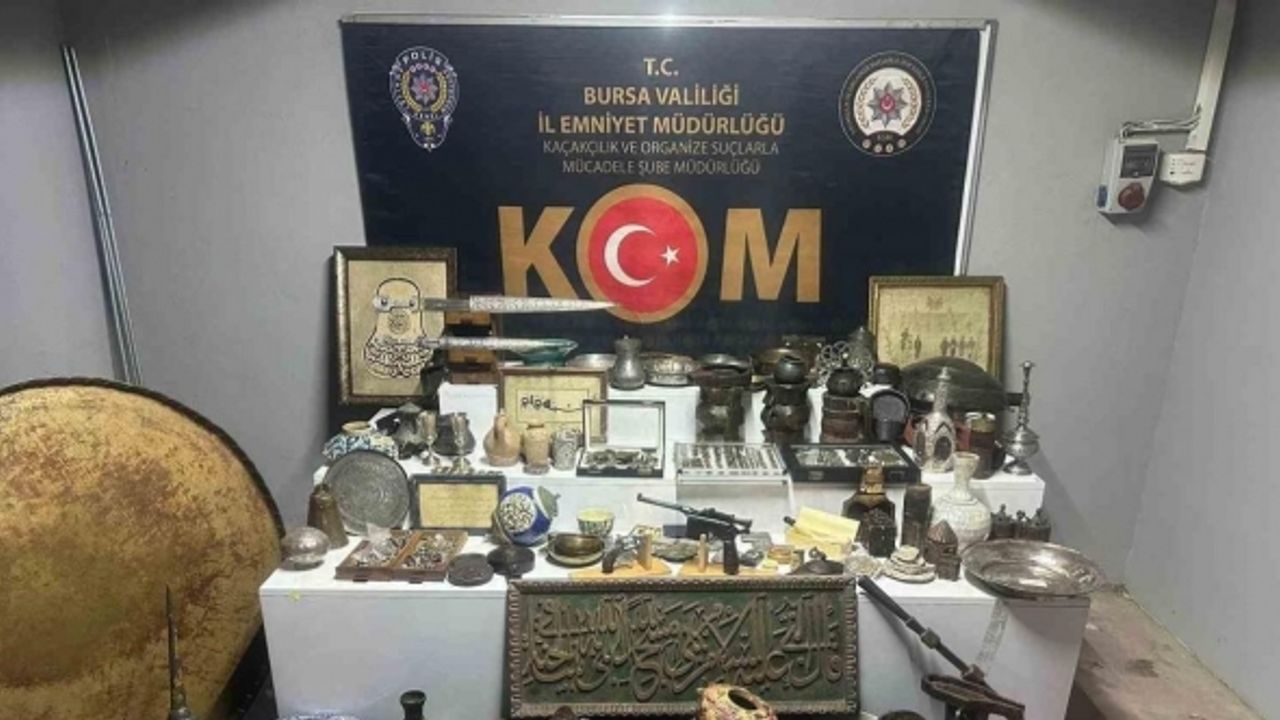 Bursa Kaçakçılık ve Organize Suçlarla Mücadele Şube Müdürlüğü merkez Nilüfer ilçesindeki bir adrese gerçekleştirdiği operasyonda çok sayıda tarihi eser ele geçirdi. M.K. isimli şahsın evinde yapılan aramalarda 403 adet üzerinde Arapça-Farsça ibareler bulunan farklı dönemlere ait mühür, 10 adet metal yüzük, 25 adet kolye, 21 adet sikke, 2 adet tarihi eser niteliğinde silah (mauser ve toplu tabanca), 20 adet üzerlerinde işlemeler bulunan tahta obje, 5 adet üzerinde Arapça-Farsça ibareler bulunan tablo, 101 adet üzerinde işlemler bulunan metal obje, 1 adet deri su matarası, 9 adet ahşap havan, 4 adet tokmak, 8 adet üzerinde işlemeler bulunan porselen obje, 2 adet üzerinde işlemeler bulunan toprak vazo, 1 adet metal sapı bulunan bakır obje, 2 adet öğütücü, 2 adet kılıç ve kını, 2 adet ahşap baston, 1 adet bakır sini ve 1 adet musluklu güğüm ele geçirildi. Ev sahibi M.K. gözaltına alınırken, adli tahkikatın devam ettiği öğrenildi.