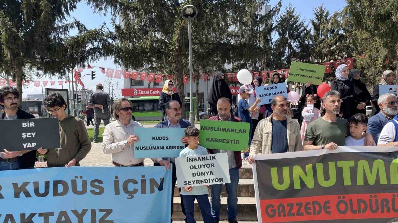 Sakarya’da Milli İrade Sivil Toplum Kuruluşları üyeleri Filistin’e destek olmak için bir araya geldi. Zulme dikkat çeken yazıların yer aldığı pankartları taşıyan vatandaşlar, İsrail’in Gazze’ye yönelik saldırıları protesto etti.
