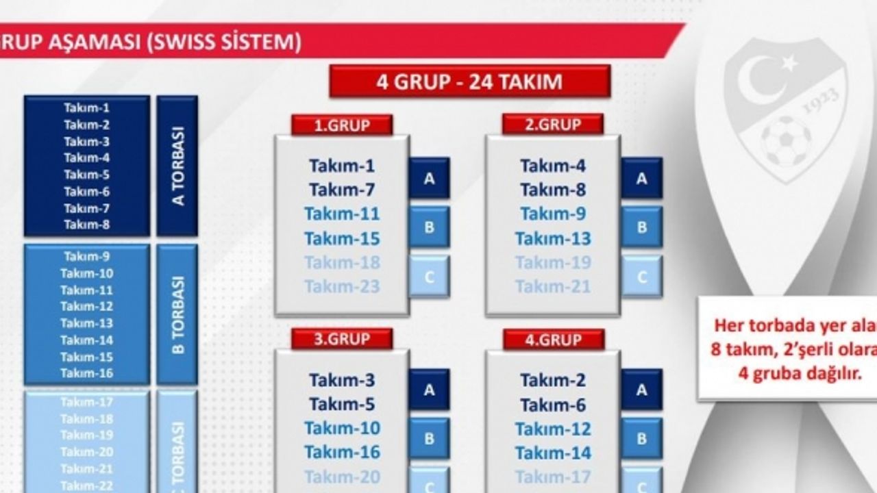 2 - Yeni formatta; gruplara katılım hakkı elde edecek 24 takım lig ve başarı sırasına göre sıralanarak 3 torbaya ayrılacak. Her torbadan 2’şer takım olmak üzere 6 takım bir grubu oluşturacak. Grup içerisinde yer alan her takım A, B ve C torbasından 1’er takım ile olmak üzere toplam 3 maç yapacak. Grup müsabakaları sonucunda ilk 2 sırada yer alan takımlar çeyrek finale yükselecek.