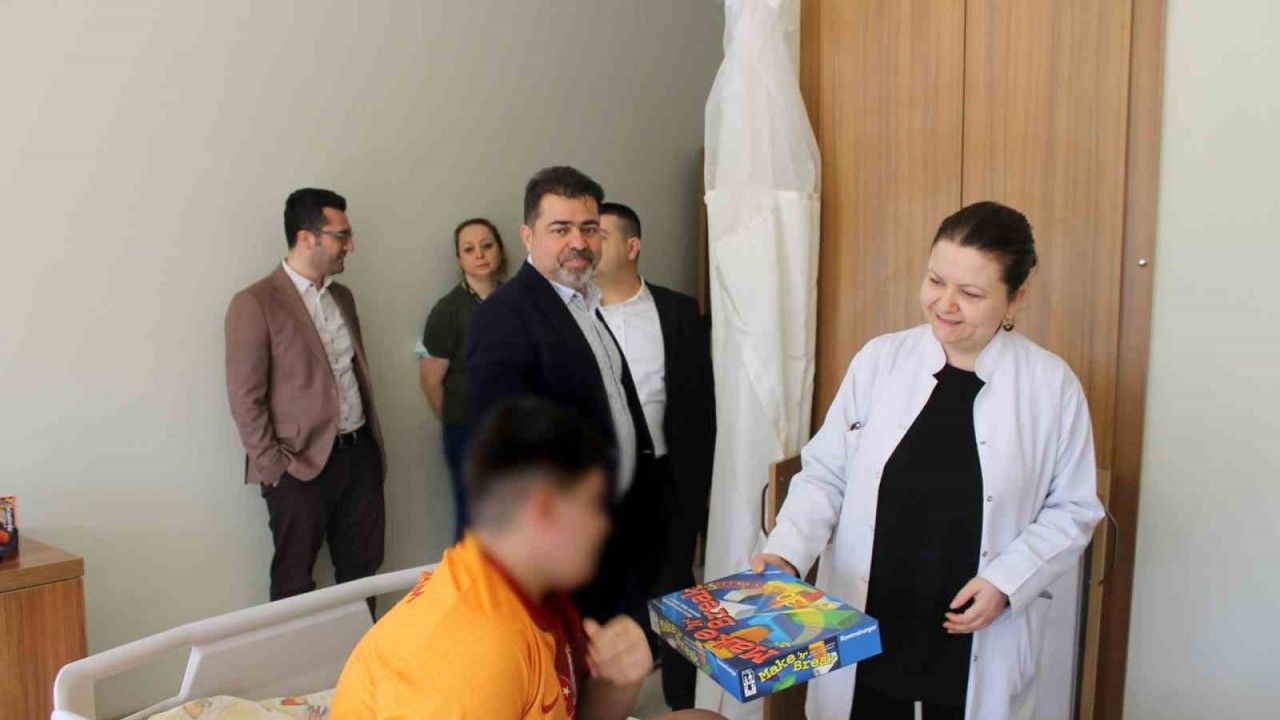 Hastane Başhekimi Prof. Dr. Şevki Hakan Eren ve hastane yönetimi tedavi gören çocuklara hediyelerini iletirken, çocukların sağlık durumlarıyla ilgili bilgi alıp, ailelerine geçmiş olsun dileklerini sundu.