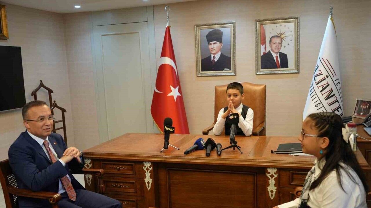 Gaziantep’te 23 Nisan Ulusal Egemenlik ve Çocuk Bayramı coşkuyla kutlandı. Kutlamalar 15 Temmuz Demokrasi meydanındaki Atatürk anıtına İl Milli Eğitim Müdürü Yasin Tepe’nin çelenk bırakmasıyla başladı. Ardından Gaziantep Valisi Kemal Çeber’in makamı öğrencilere devretmesiyle devam etti. Gaziantep Valisi Kemal Çeber’in makam koltuğuna Çağdaş Ata Daşdemir ve yardımcısı olarak Duru Altınay oturdu. Temsili Vali Çağdaş Ata Daşdemir ve Duru Altınay, günün anlam ve önemine ilişkin konuşmasında bütün dünya çocuklarının 23 Nisan Ulusal Egemenlik ve Çocuk Bayramı’nı kutlayarak, kendilerine bugünü armağan eden Gazi Mustafa Kemal Atatürk’ü saygıyla andı. Çocukları makamda karşılayan Kemal Çeber ise makamını devrettiği öğrencilere Gaziantep’te yapılması gereken çalışmaları sorması üzerine makamı devralan Çağdaş Ata Daşdemir ve Duygu Altınay ise şehirde park ve yeşil alanların arttırılması, güvenliklerinin sağlanması gerektiğini söyleyerek ilgili birimlere talimat verdi.