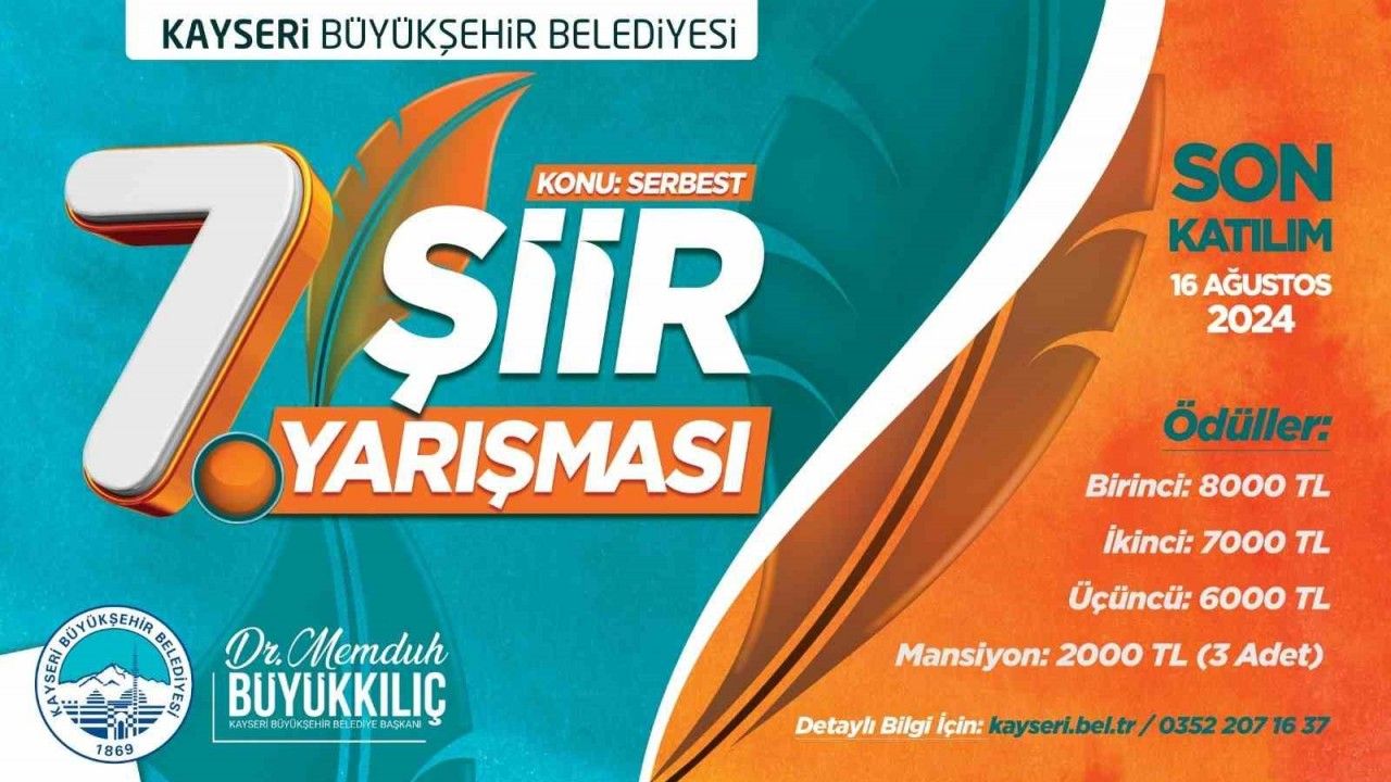 Kayseri Büyükşehir Belediyesi, geleneksel hale getirdiği ve her yıl edebiyatseverlerin yoğun ilgi gösterdiği şiir yarışmasının 7’ncisini düzenliyor. Büyükşehir 7’nci Şiir Yarışması’nda toplam 27 bin TL ödül dağıtacak.
