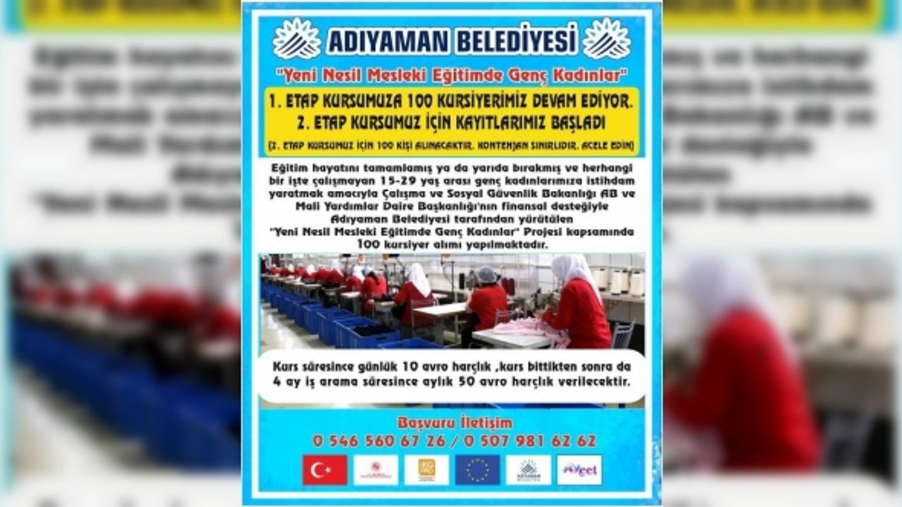 Adıyaman Belediyesi tarafından genç kadınların istihdam edilmesi adına hayata geçirilen ve başvuru şartları arasında eğitim hayatını tamamlamış ya da yarıda bırakmış ve herhangi bir işte çalışmayan 15-29 yaş arası genç kadınların başvuru yapabildiği "Yeni nesil mesleki eğitimde genç kadınlar" projesinde ilk etap kursları devam ederken 2. Etap kursları için 100 kişilik kontenjanla sınırlı olan başvurular başladı.