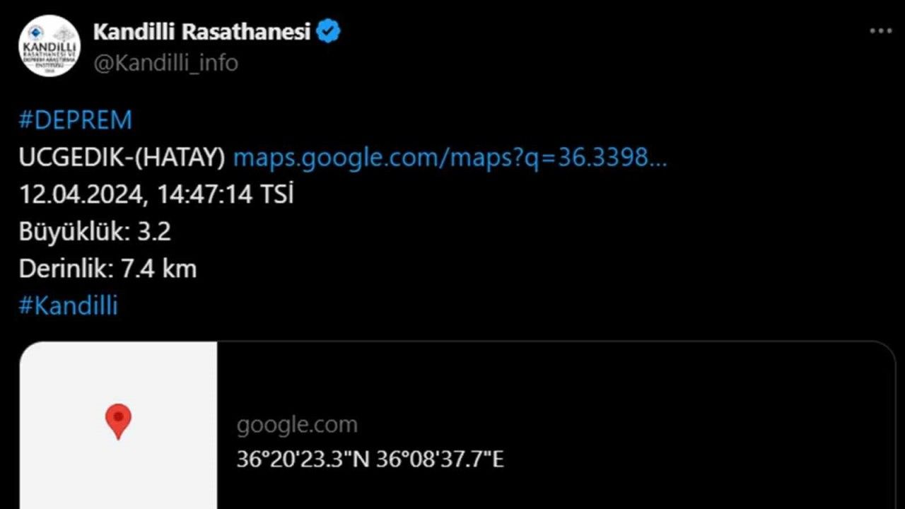 Kandilli Rasathanesi verilerine göre Hatay’ın Antakya ilçesi Üçgedik Mahallesi’nde saat 14.47 sıralarında 3.2 büyüklüğünde deprem meydana geldi. Yerin 7.4 km derinliğinde meydana gelen deprem Antakya, İskenderun, Kırıkhan, Belen ve Altınözü ilçesinde hissedildi. Deprem sonrası olumsuz bir durum yaşanmazken, vatandaşlar depremi hissettiklerini söylediler.