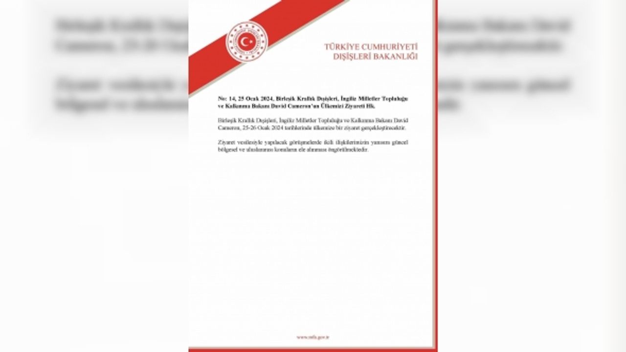 Dışişleri Bakanlığından yapılan yazılı açıklamada, Birleşik Krallık Dışişleri, İngiliz Milletler Topluluğu ve Kalkınma Bakanı David Cameron’un 25-26 Ocak tarihleri arasında Türkiye’ye bir ziyaret gerçekleştireceği belirtildi. Ziyaret çerçevesinde yapılacak görüşmelerde ikili ilişkilerin yanı sıra güncel bölgesel ve uluslararası konuların ele alınacağı kaydedildi.