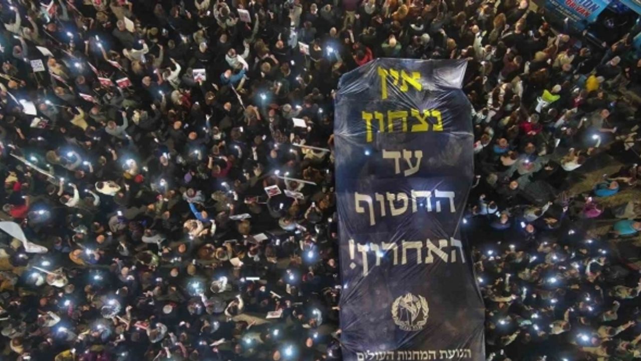 İsrail’in Gazze Şeridi’ne yönelik saldırıları 7 Ekim’den bu yana devam ederken, Gazze Şeridi’nde tutulan İsrailli esirlerin yakınları seslerini duyurabilmek için protestolarını sürdürüyor. Esirler ve Kayıp Kişilerin Aileleri Forumu tarafından organize edilen protesto için esir yakınları, İsrail’in başkenti Tel Aviv’de bulunan Kirya Askeri Üssü’nün önünde toplandı. Esirlerin serbest bırakılması çağrısında bulunan göstericiler, ellerinde esirlerin fotoğraflarını taşıdı. Göstericiler ayrıca, “Herkes dönene kadar durmayacağız” yazılı pankart açtı. Protesto sırasında Gazze Şeridi’ndeki insani ara kapsamında serbest bırakılan İsrailli bazı esirlerde konuşma yaptı.