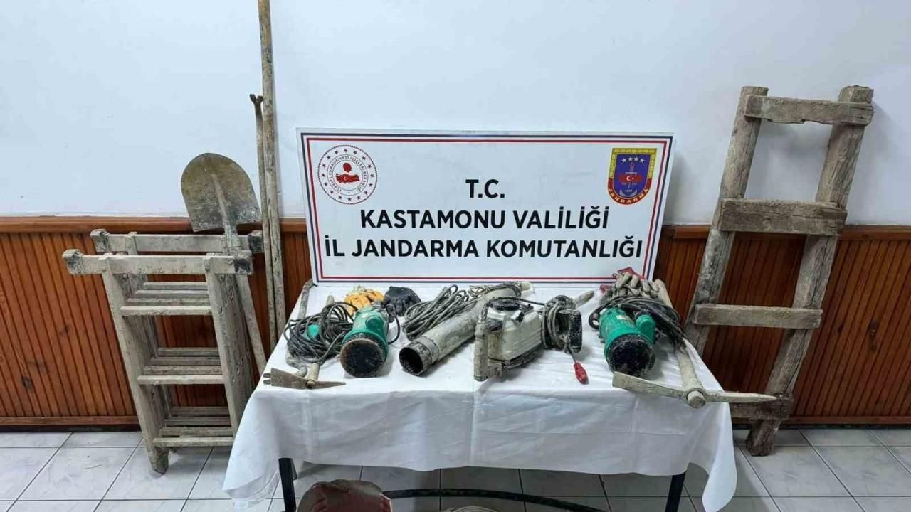 Kastamonu İl Jandarma Komutanlığınca tarihi eser kaçakçılığının önlenmesine yönelik yapılan çalışmalar neticesinde, H.D., Ö.T. ve A.S. isimli şahısların Kastamonu’nun Araç ilçesinde izinsiz kazı yaptıkları tespit edildi. Ekipler tarafından yapılan baskınla şahıslar suçüstü yakalandı. Olay yerinde yapılan aramada beton kırma makinesi, dalgıç pompa, merdivenler, su tahliye motoru, uzatma kablosu, kazma, kürek, eldiven, halat, manivela ve tornavida ele geçirildi.