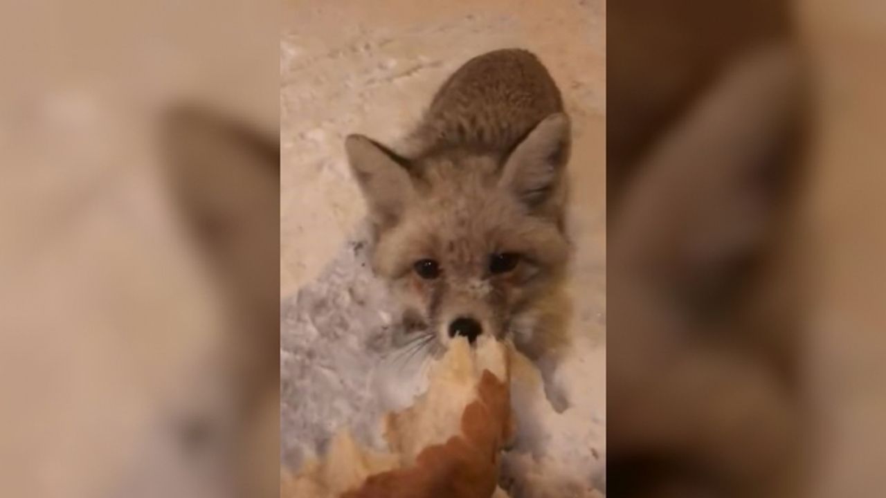 Soğuk havada yiyecek arayan tilki, Damal ilçe merkezine kadar geldi. Bir vatandaşın evinin önüne kadar gelen tilki, ekmekle beslendi. Kendine verilen ekmeği alan tilki karla kaplı alanda ilerleyerek gözden kayboldu.