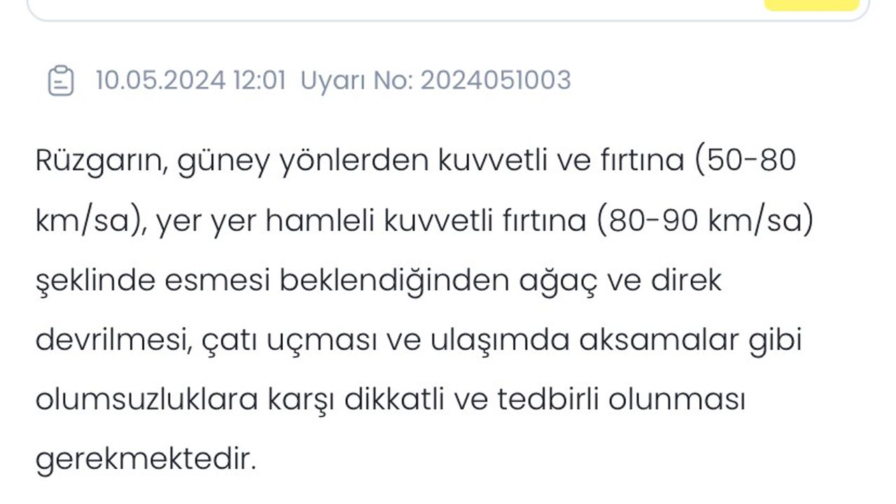 Karaman Valiliği, meteorolojik verilere göre 11 Mayıs Cumartesi günü sabah saatlerinden itibaren beklenen kuvvetli rüzgar ve fırtınaya karşı vatandaşları uyardı. Valiliğin sosyal medya hesabından yapılan paylaşımda, "Karaman merkezi ile Kazımkarabekir ve Ayrancı ilçelerinde saatle hız yer yer 80-90 kilometreyi bulacak olan şiddetli rüzgar ve fırtına görülecektir. Bu nedenle olumsuz hava şartlarında yaşanabilecek durumlara karşı dikkatli ve tedbirli olunması gerekmektedir" denildi.