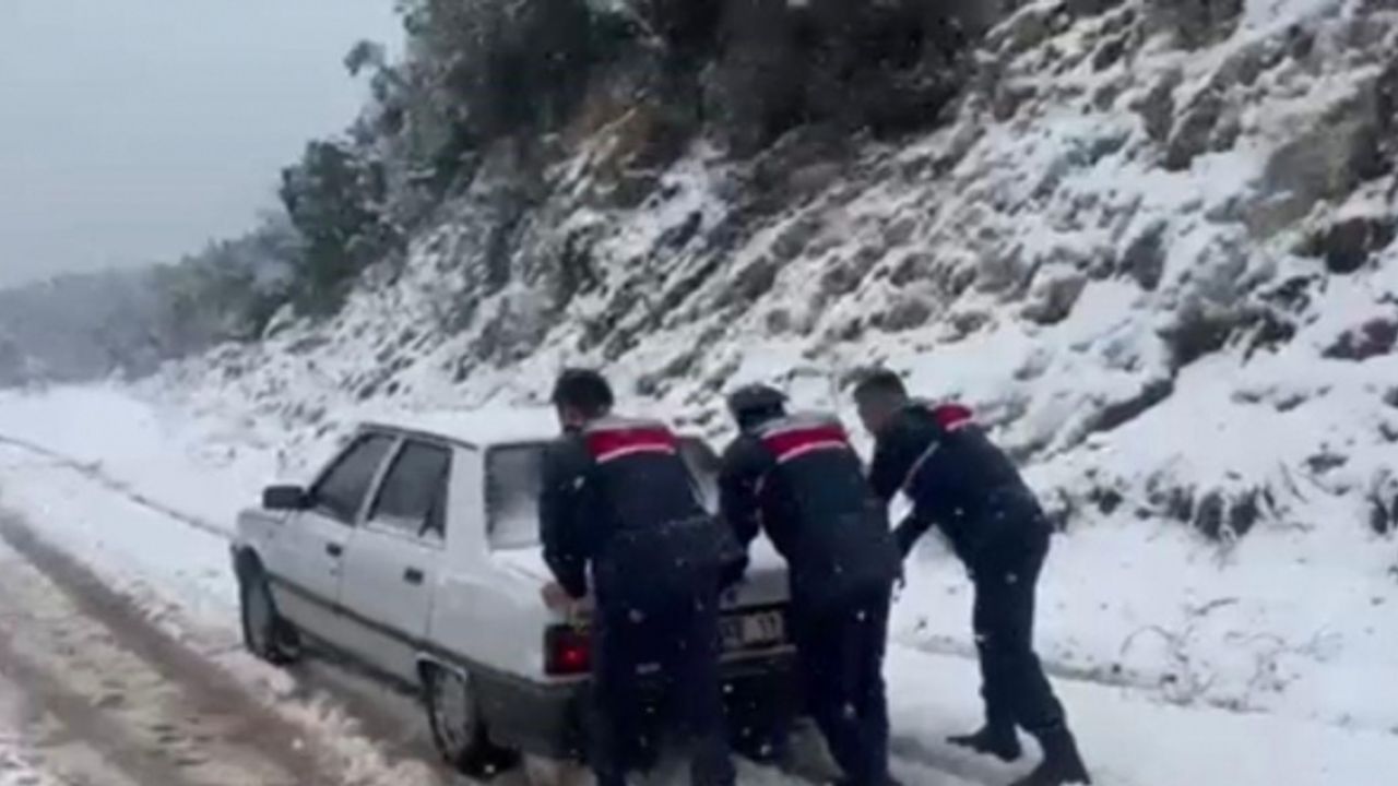 Mersin’in Erdemli ilçesinde kar yağışı nedeniyle yolda kalanların yardımına karayolları ile jandarma ekipleri yetişti. Jandarma personelleri karda kalan bazı araçları iteleyerek kurtardı.