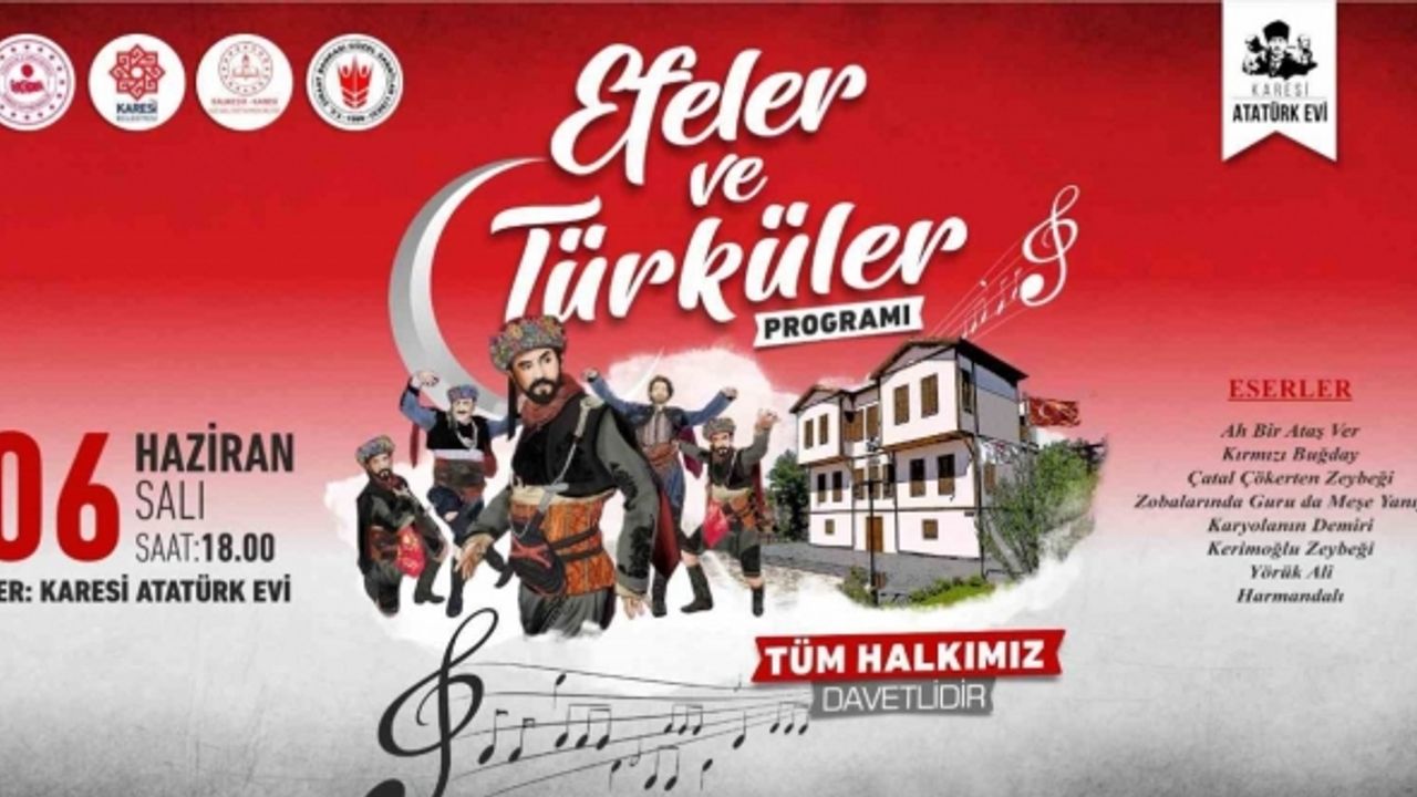 Kuva-yi Milliye şehri Balıkesir’e değer katan Karesi Atatürk Evi’nde “Efeler ve Türküler” programı düzenlenecek. 6 Haziran Salı günü gerçekleştirilecek olan programda T.C. Ziraat Bankası Güzel Sanatlar Lisesi öğretmen ve öğrencilerinin hazırladığı gösteriler sunulacak.