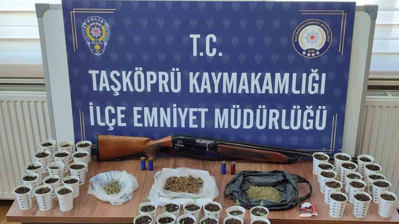 Edinilen bilgiye göre, Taşköprü İlçe Emniyet Müdürlüğü ekipleri tarafından gerçekleştirilen operasyonda, uyuşturucu madde ticareti yaptığı şüphesiyle bir şahsın evinde arama yapıldı. Yapılan arama sonucunda 60 adet karton bardak içerisinde yetiştirilmiş kenevir bitkisi ve 180 gram esrar ile 4 gram esrar tohumu ele geçirildi. Ayrıca, evde yapılan aramada bir adet ruhsatsız tüfek ve tüfeğe ait 4 adet fişek bulundu.