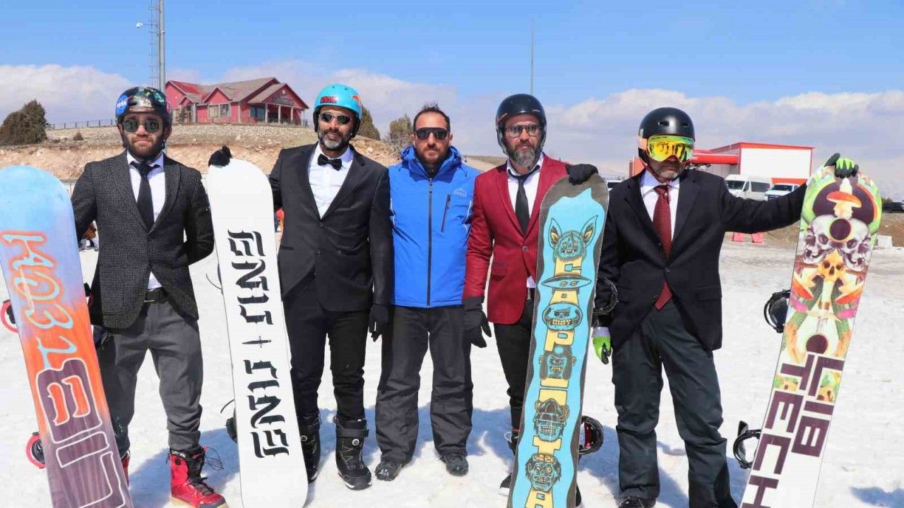 Erzincan’da bulunan Ergan Dağı’nda buluşan bir grup vatandaş, takım elbise, kravat ve papyonla snowboard yaparak kayak sezonunu uğurladı.
