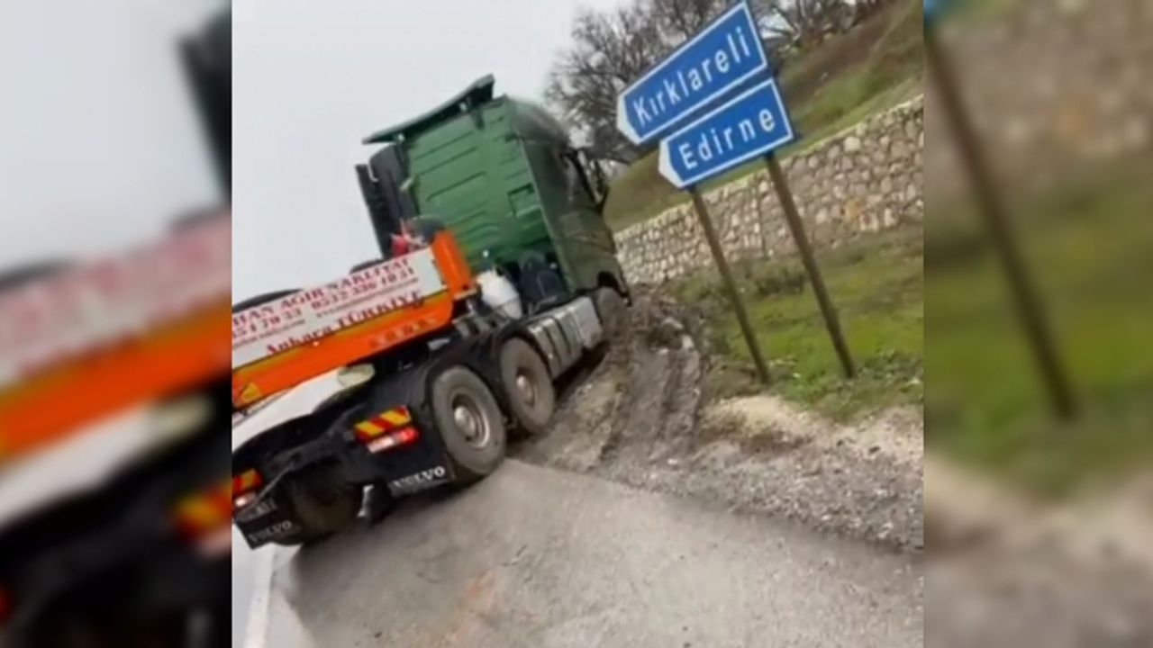 Kırklareli’nin Babaeski ilçesinde faaliyet gösteren bir firmaya ait çok tekerli dorsesiyle çelik konstrüksiyon taşıyan tır, kavşakta yoldan çıkarak çamura saplanması sonucu D-100 Karayolu’nu ulaşıma kapattı.
