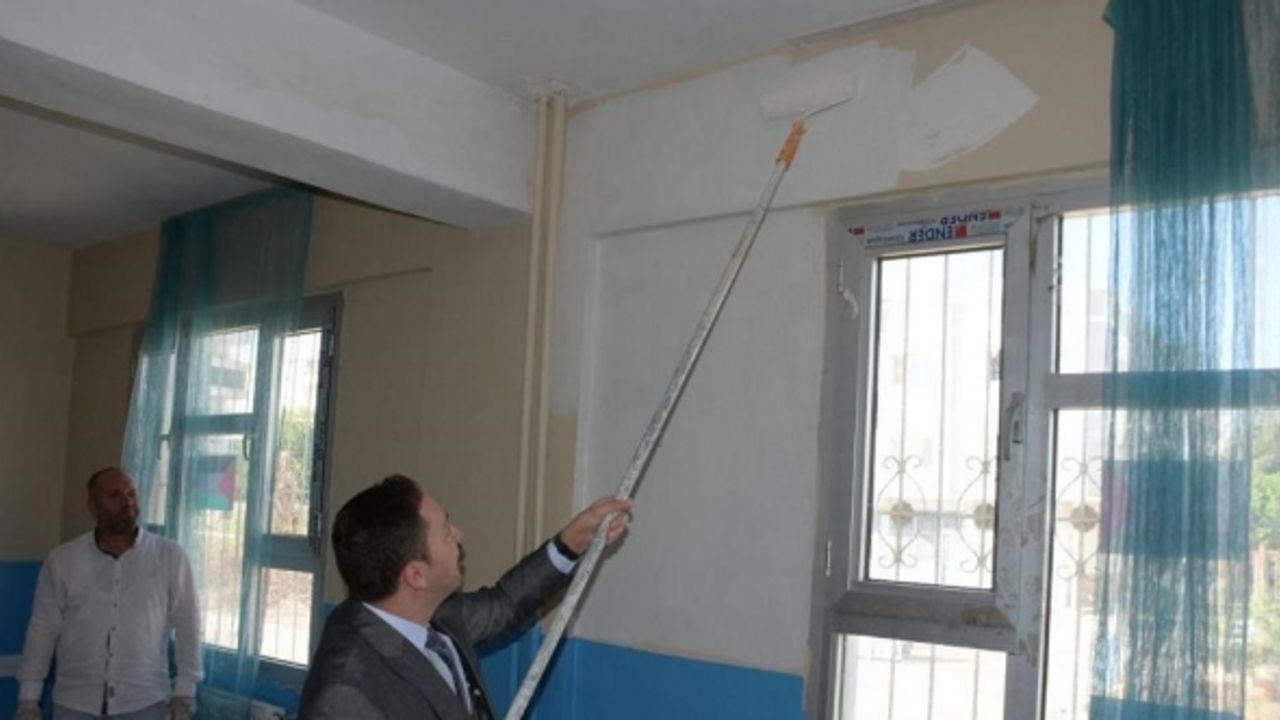 Mardin’in Nusaybin Kaymakamı ve Belediye Başkan Vekili Ercan Kayabaşı, ara tatilde onarımı yapılan okulda fırçayı eline alarak bir süre duvar boyadı.