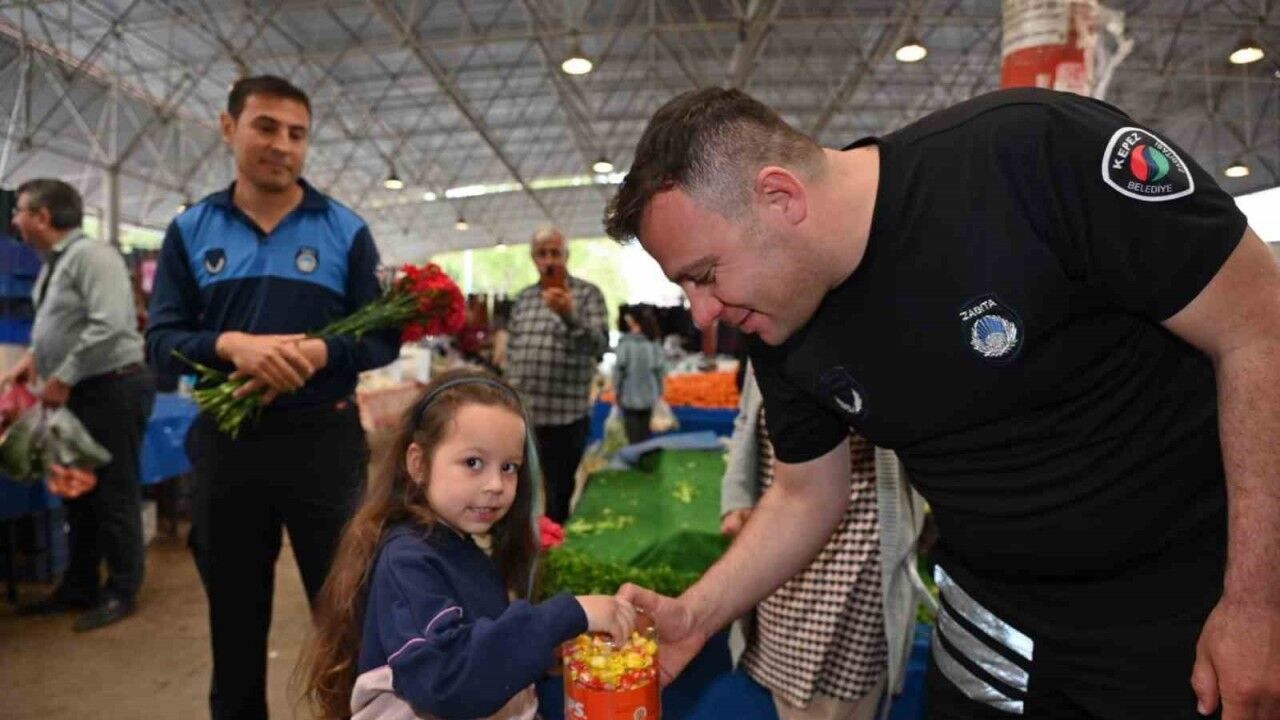 Kepez Belediyesi Zabıta Müdürlüğü ekipleri, Ramazan Bayramı arifesinde bayram alışverişi yapan vatandaşlara çiçek ve bayram şekeri dağıttı.